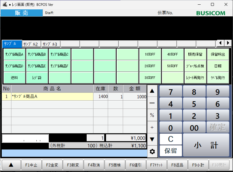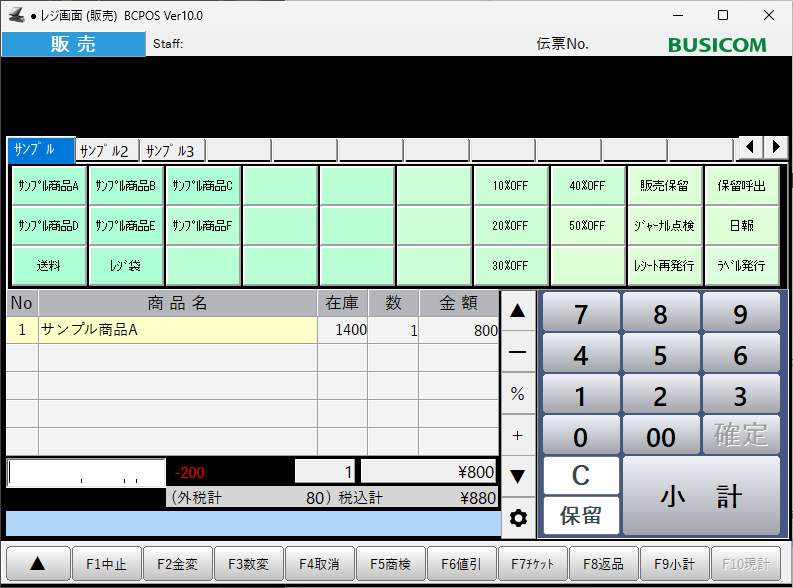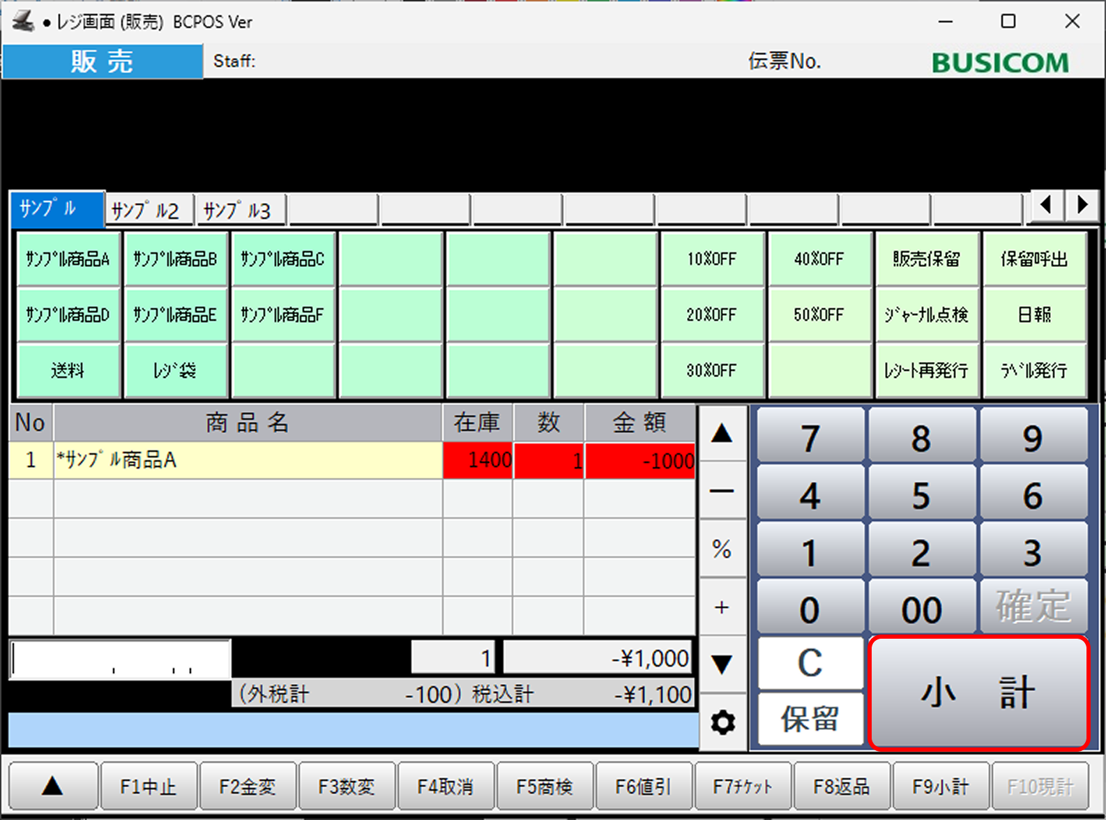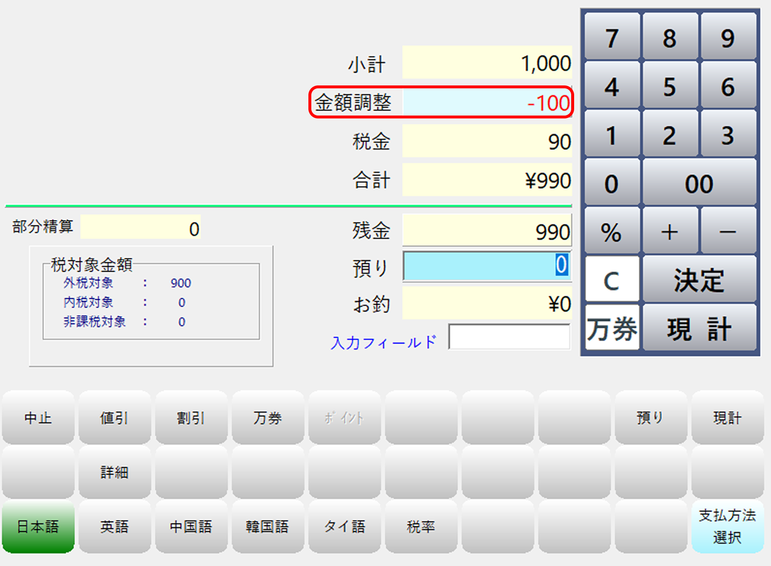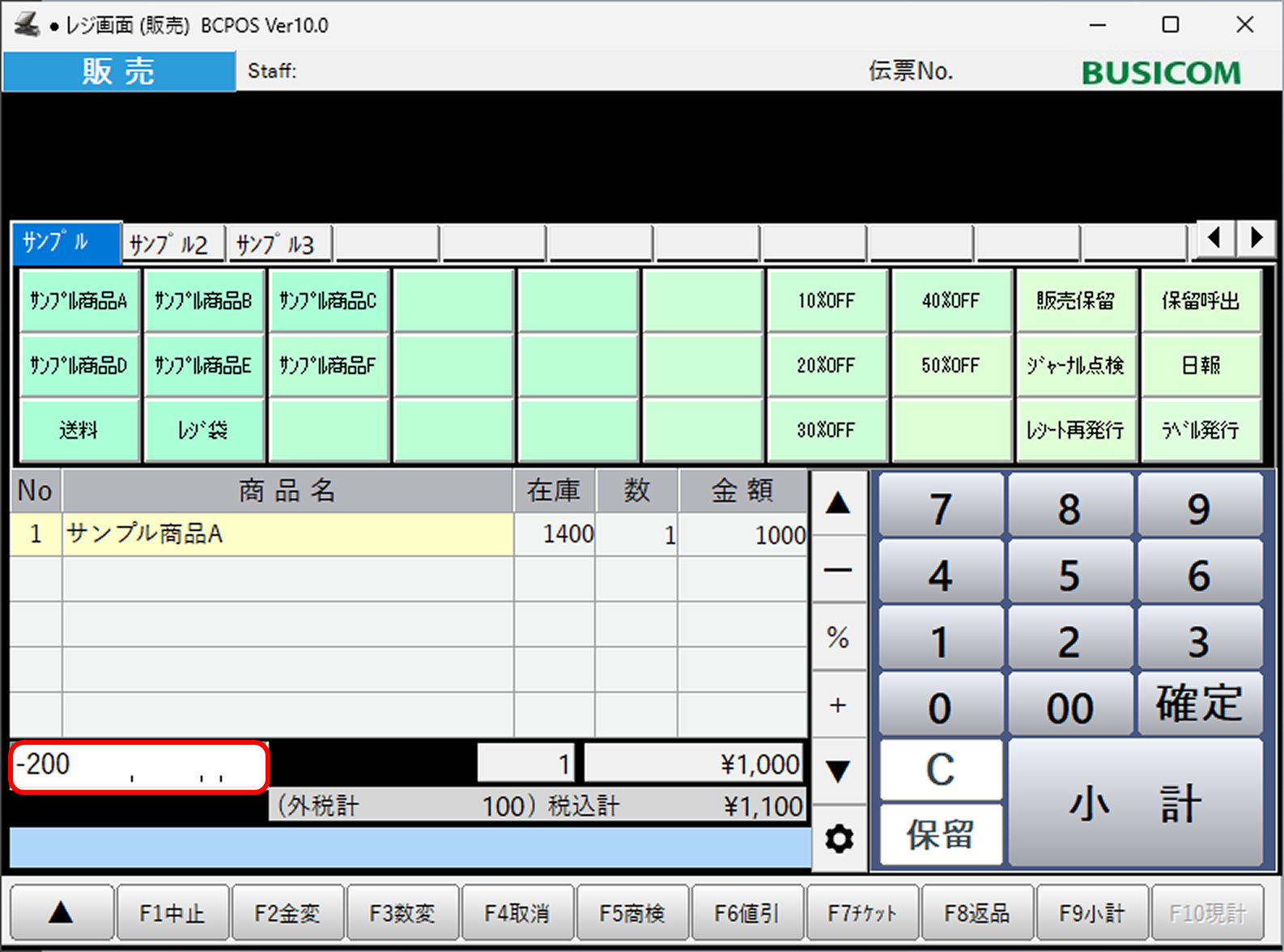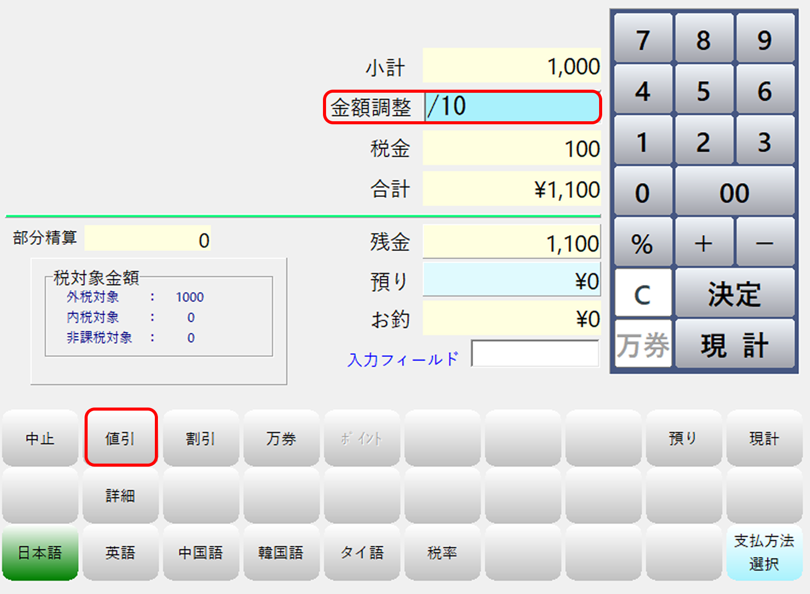レジ画面で商品を呼び出した後、右下の数字キーで値引したい金額をマイナスで入力します。