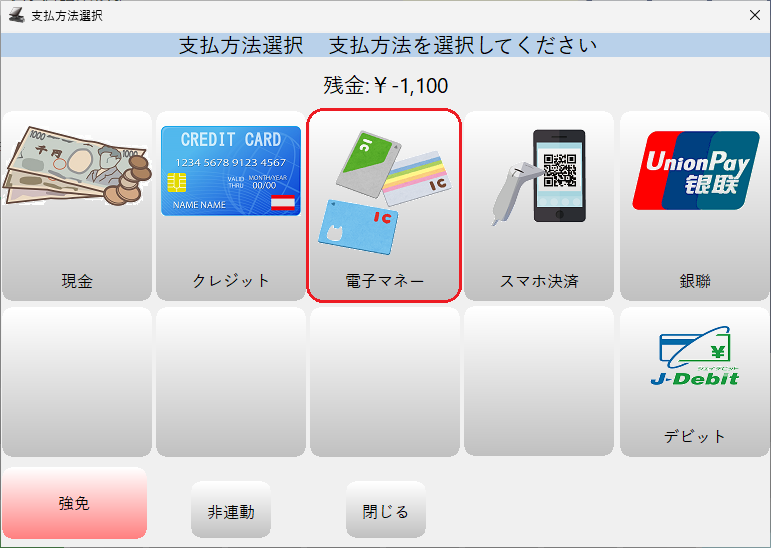 残金がある場合は小計画面右下の「支払方法選択」(セミセルフレジ利用時は「セミセルフ」)ボタンを押して、他のお支払い方法を指定してください。
