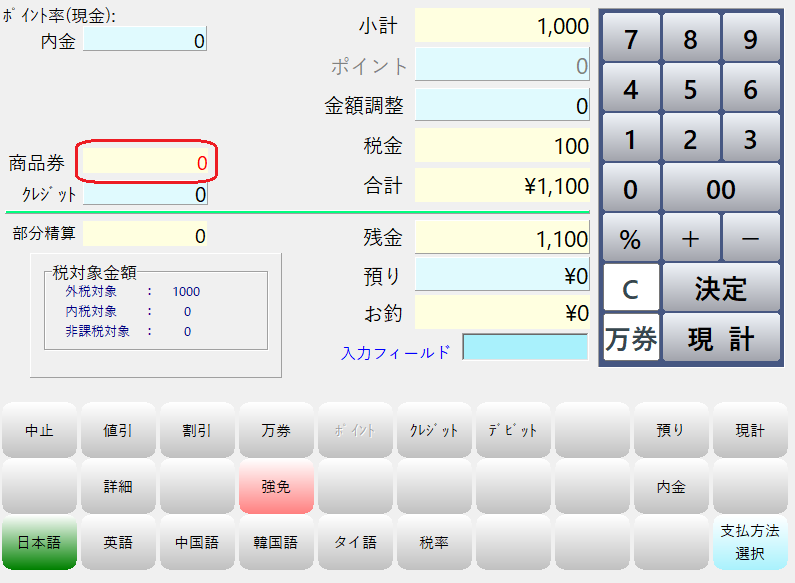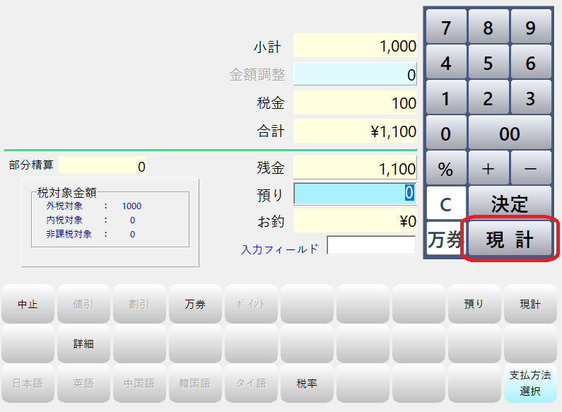 「預り」にお預かりした現金金額を入力して「現計」を押します。