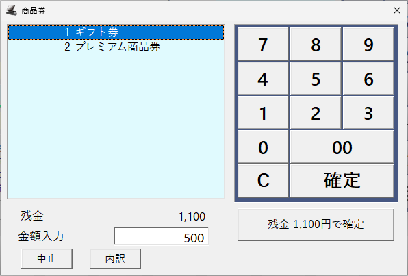 登録している商品券から選択し、必要な場合は金額を変更します。