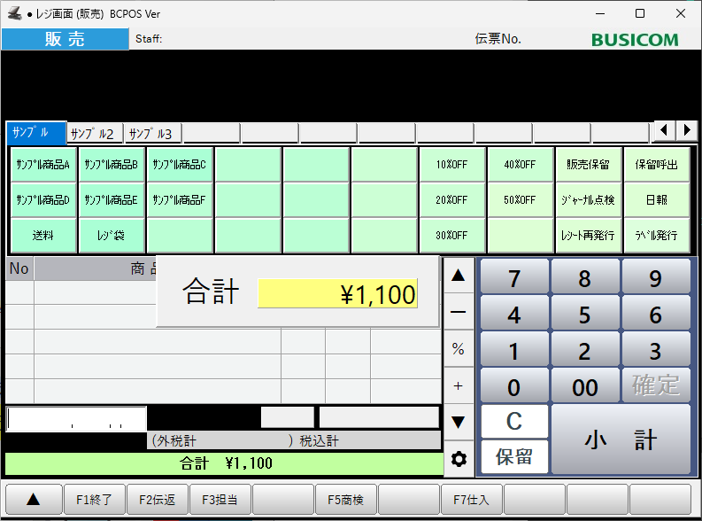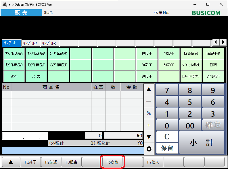 商品を検索して呼び出す場合は画面下部の「F5商検」ボタンから検索して呼び出します。