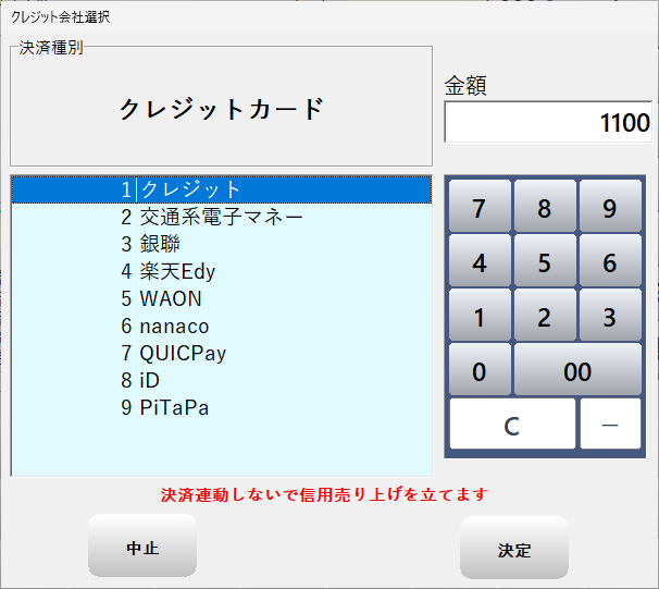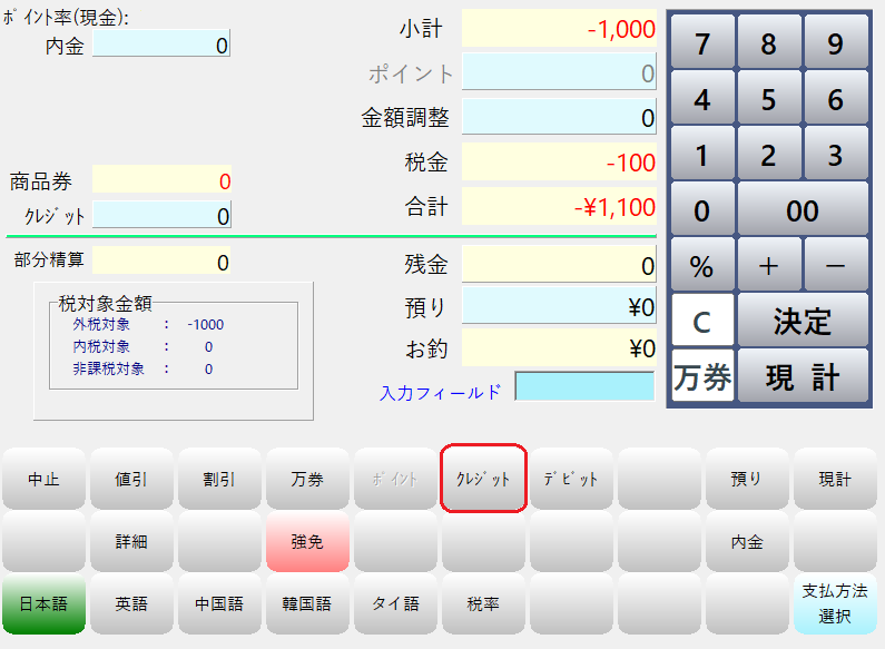 レジ画面で商品を呼び出して小計画面に進み、画面下部の「クレジット」ボタンを押します。