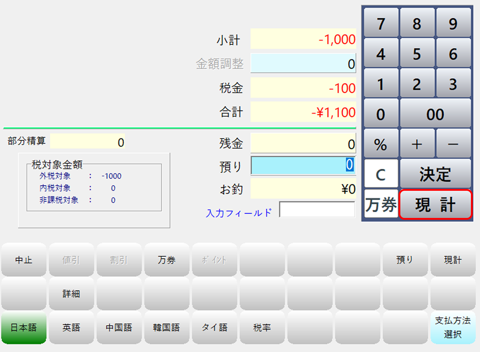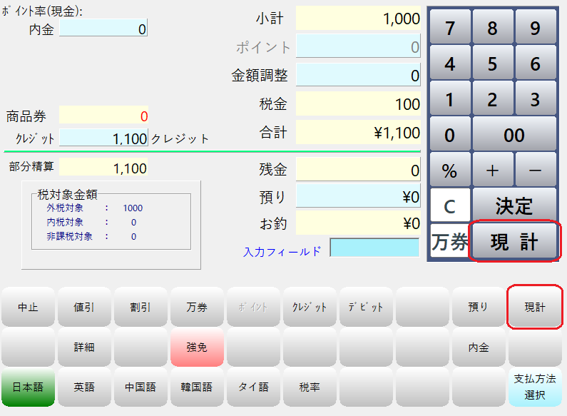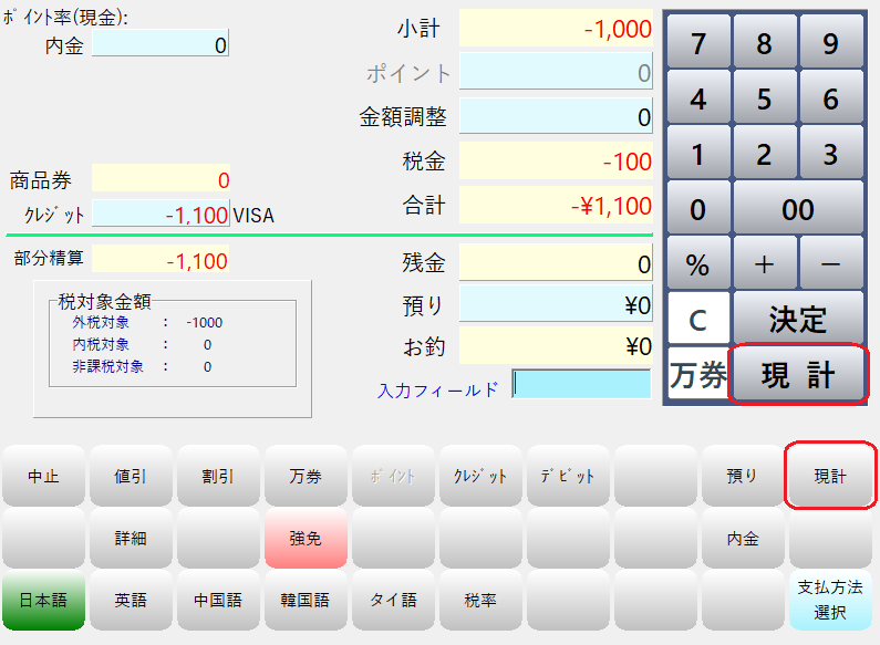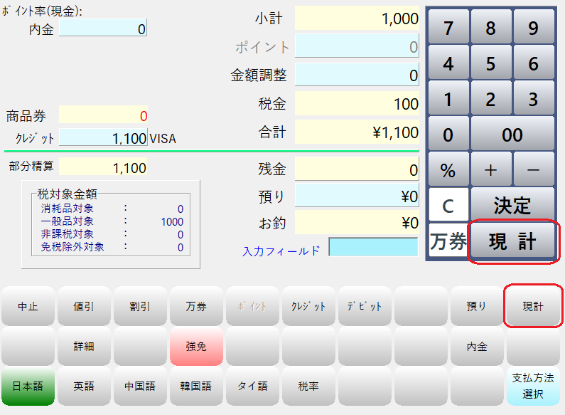 残金が0円になっている事を確認後、「現計」ボタンを押してお会計を完了します。