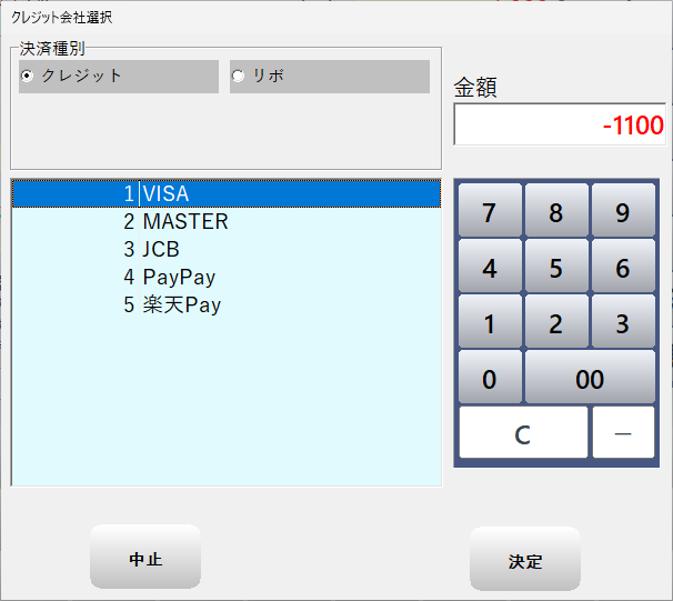 決済の内容を選択して「決定」ボタンを押します。