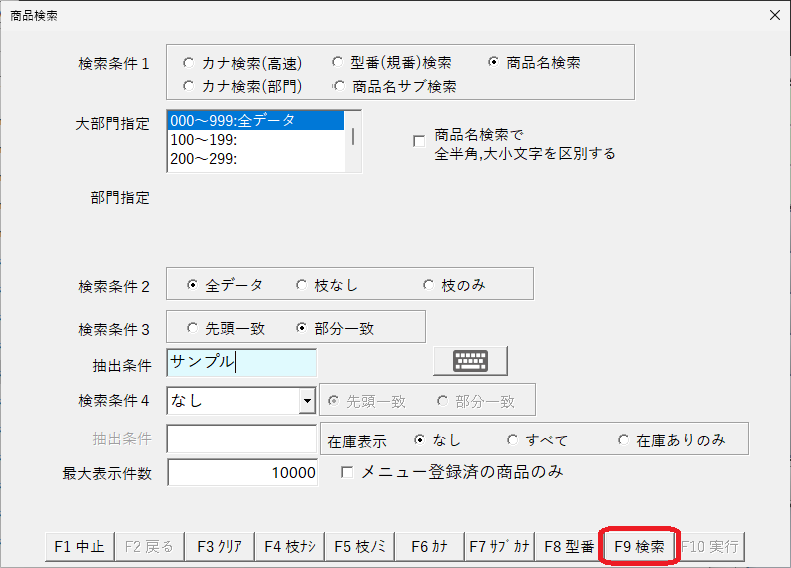 (画像例:検索条件1「商品名検索」、検索条件2「全データ」、検索条件3「部分一致」、抽出条件に「サンプル」を入力しています。)