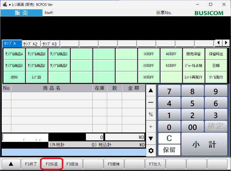レジ画面の「F2伝返」ボタンを押します。
