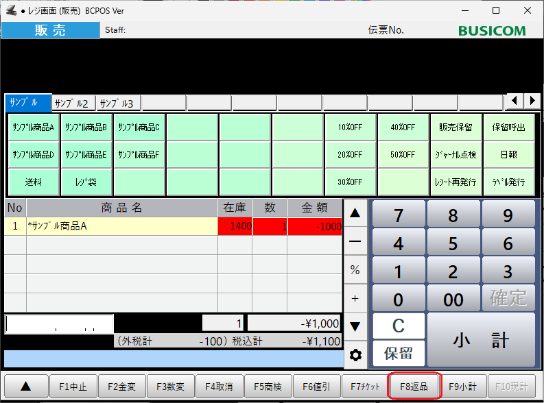 レジ画面で商品を呼び出して画面下の「F8返品」を押します。