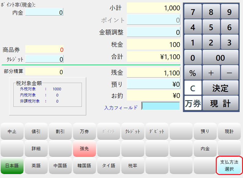 レジ画面で商品を呼び出して小計画面に進み、小計画面右下の「支払方法選択」を押して支払方法選択画面を表示します。