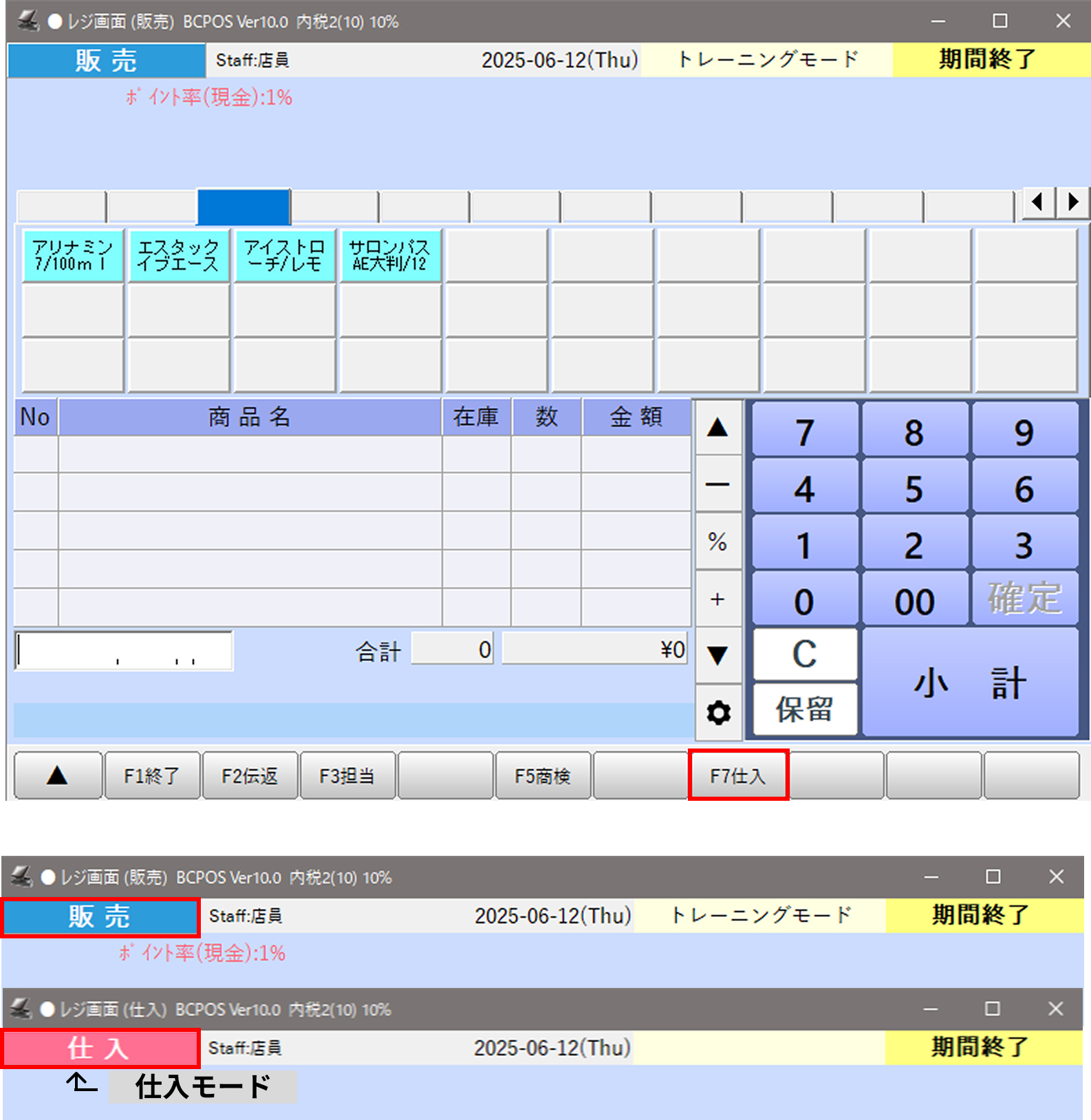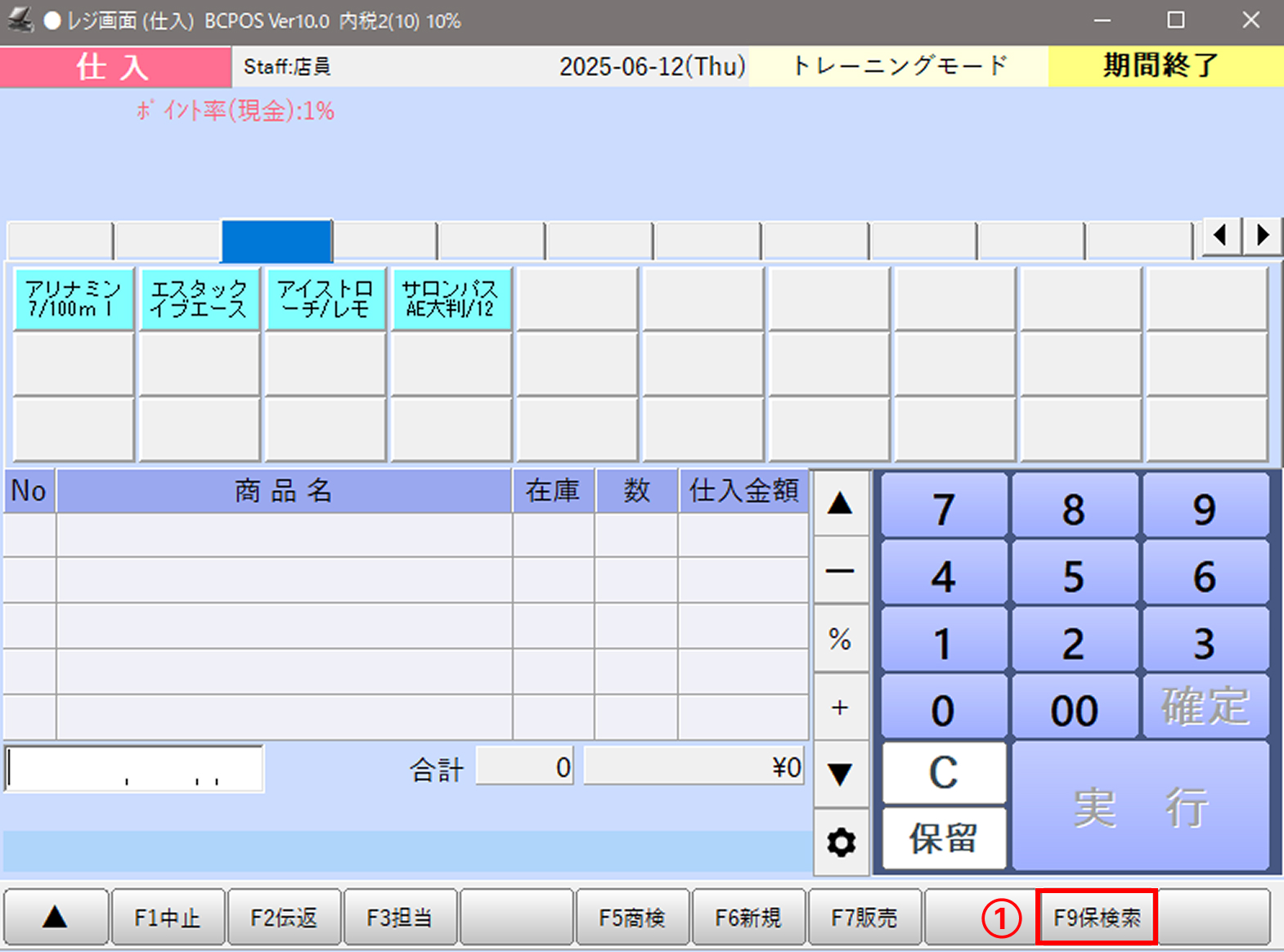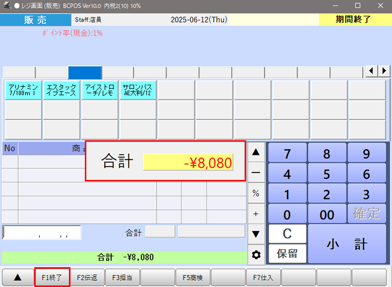画面下部の「F1 終了」を押すと仕入モードが終了し、通常の販売画面に戻ります。