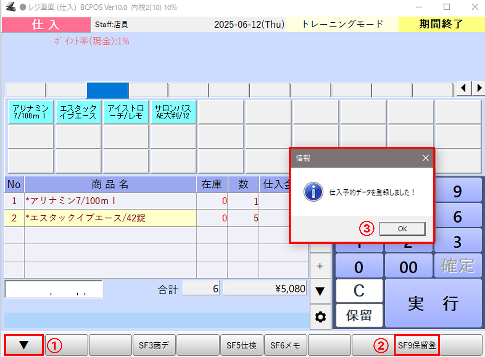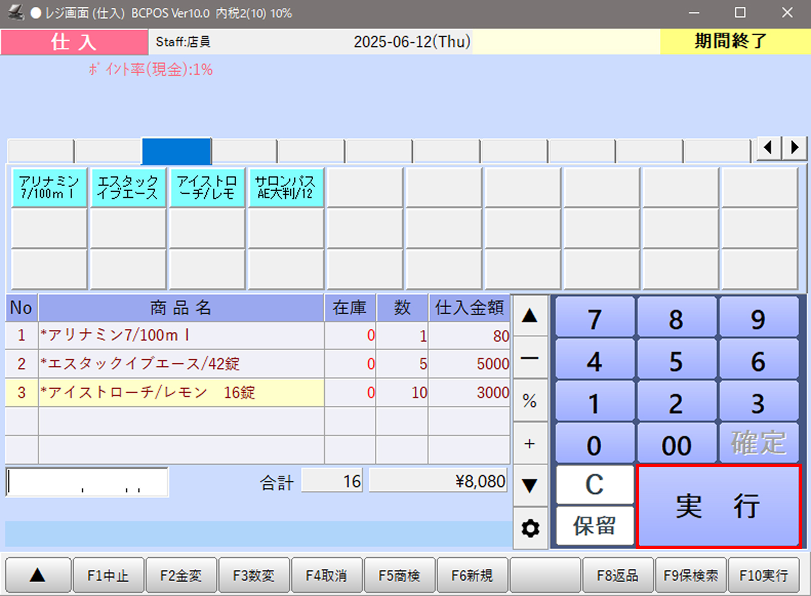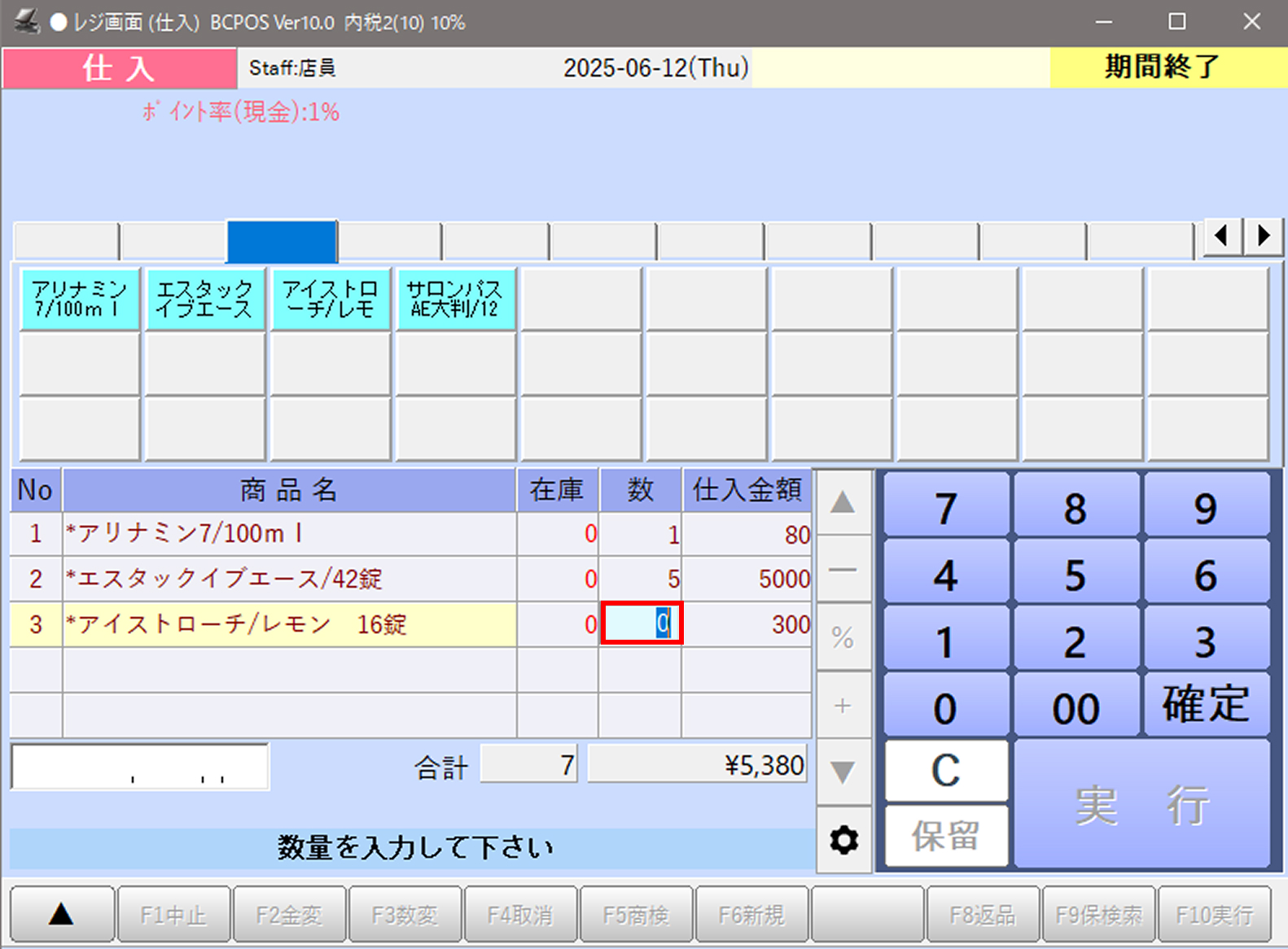 画面下部の「F1 終了」を押すと仕入モードが終了し、通常の販売画面に戻ります。