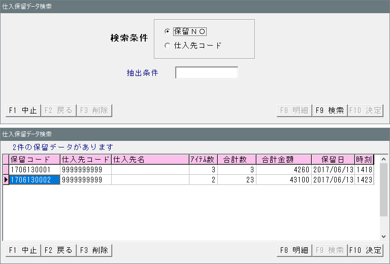 ※抽出条件を入力しないで「F9 検索」を押すと、保留データを全て表示します