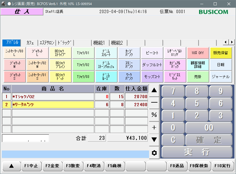(間違えて商品を呼び出した場合などは該当商品を選んだ状態で画面下部の「F4 取消」を押すことで、商品が取り消されます。)