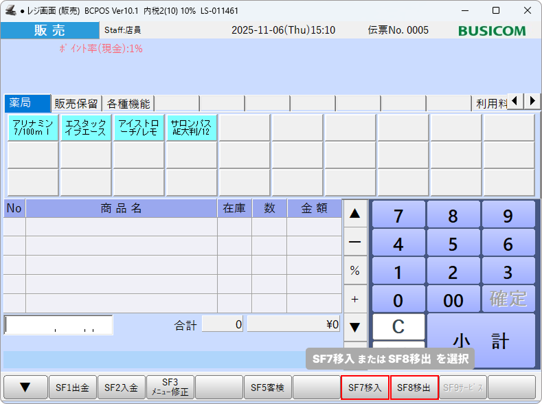 「SF7移入」(もしくは「SF8移出」)を押します。