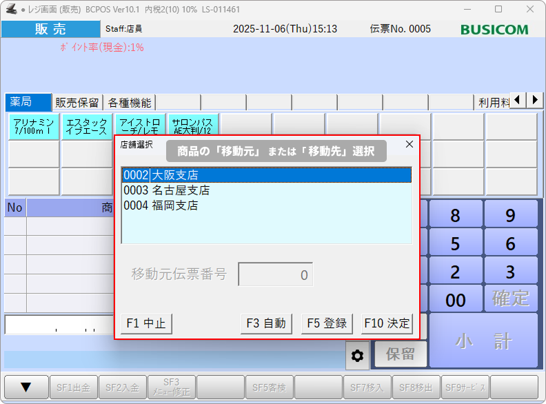 ②-「店舗選択」画面が表示されるので、商品の移動元(または移動先)店舗を選択し、「F10決定」を押します。