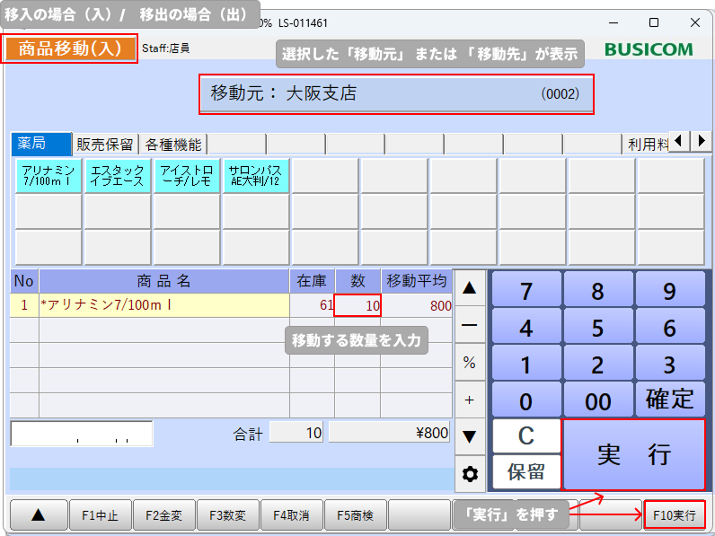⑥-入力が完了したら、テンキー部分の「実行」または画面下部の「F10実行」を押します。