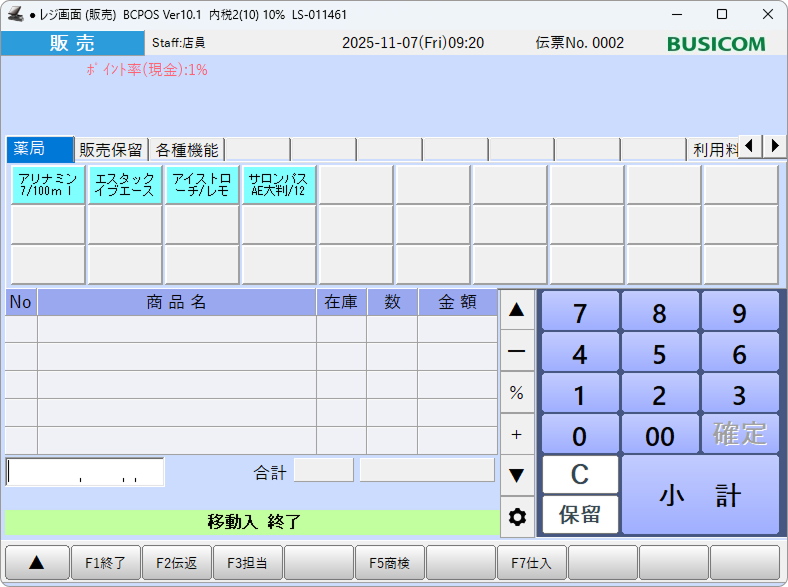 ⑦-画面下部に「移動入 終了」(または「移動出 終了」)の表示がされ、レシートが発行されます。