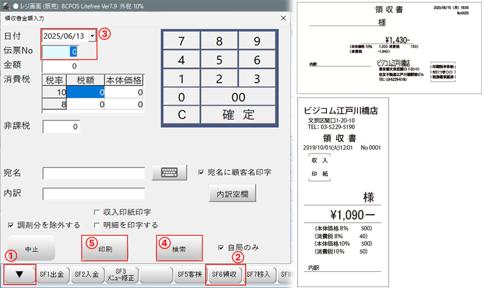 ●領収書についての設定については「F6基本設定」 > 「F2 全般設定」 > 「レシート」 をご確認ください