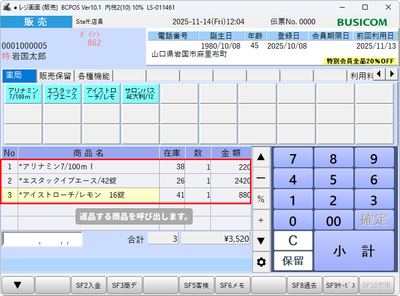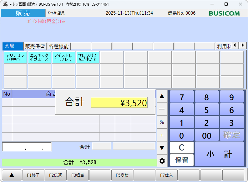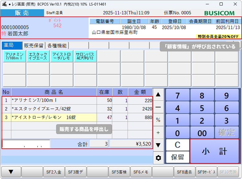 ③-顧客がレジ上部に呼び出されたのを確認できたら、販売する商品を呼び出し、「小計」ボタンを押します。