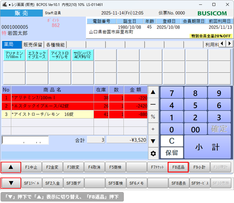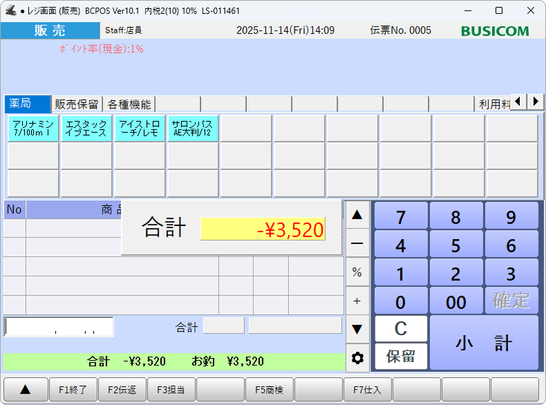 ⑨-レジ画面に返品金額が表示されると、売掛返品の処理は完了です。