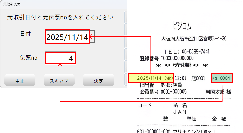 ⑦-「元取引入力」画面が表示されますので、売掛販売を行った「日付」「伝票no」を入力し、「決定」を押してください。
