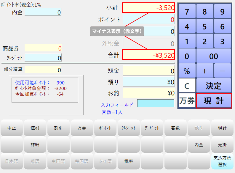 ⑧-マイナスで金額が表示されるのを確認し、「現計」を押します。