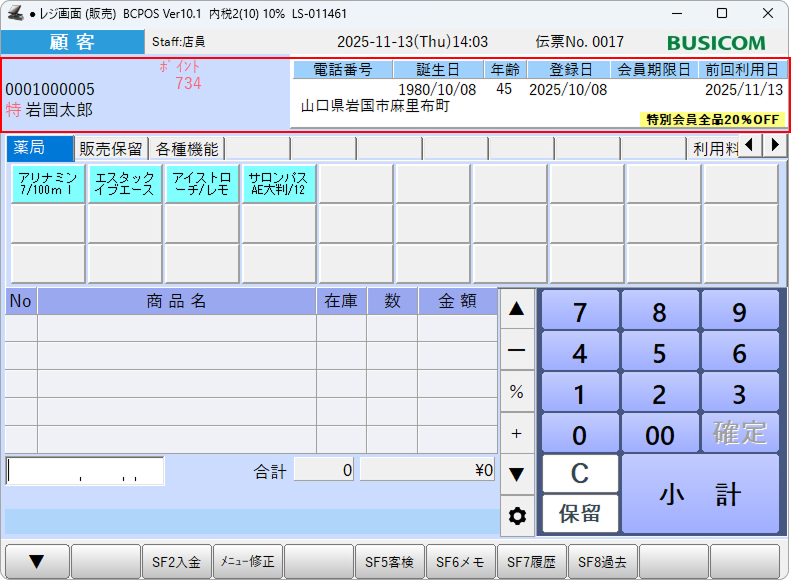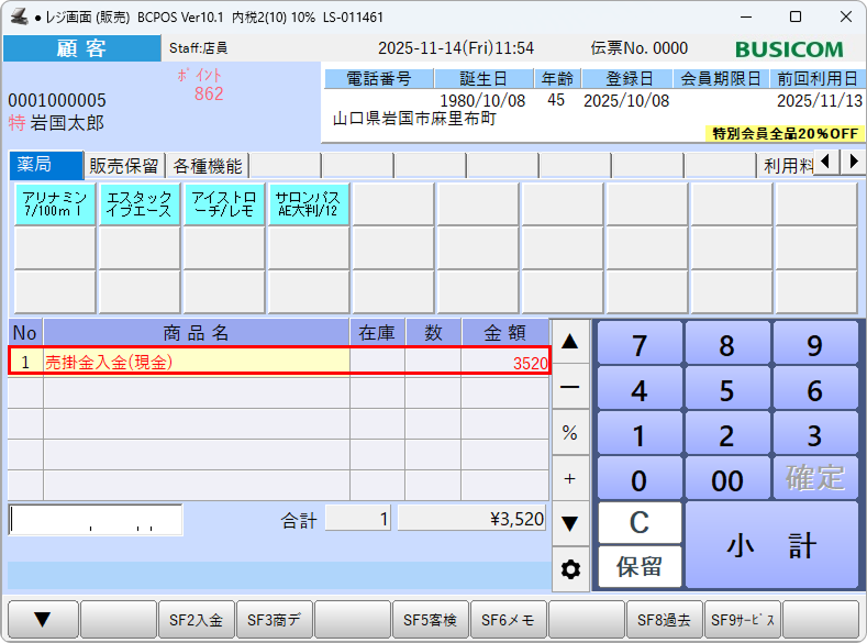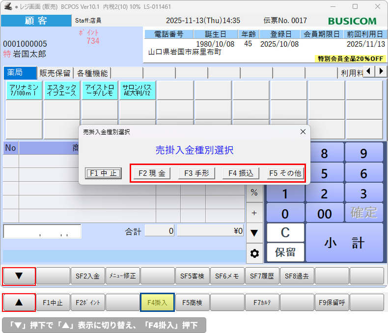 ④-レジ画面下部の「SF4掛入」ボタンを押します。