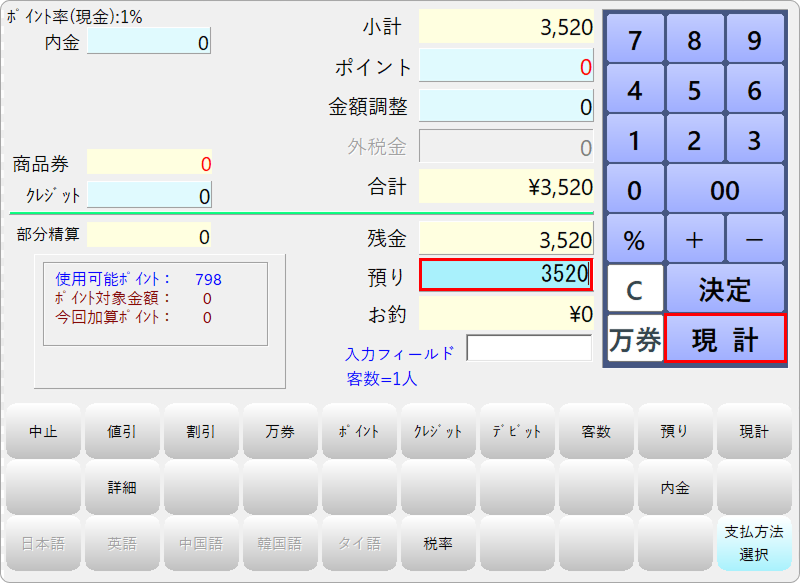 ⑦-「小計画面」が開きますので、「預り」の欄に売掛金の入金金額を入力し、「現計」を押します。