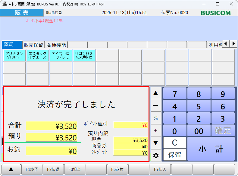 ⑧-レジ画面に「決済が完了しました」と表示され、売掛入金の処理が完了します。
