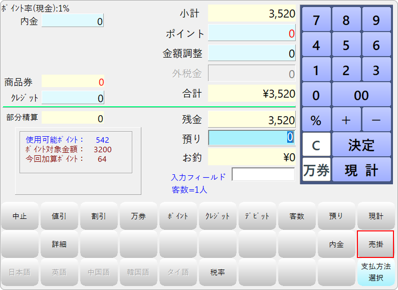 ④-「小計画面」が開きますので、右下の「売掛」ボタンを押します。