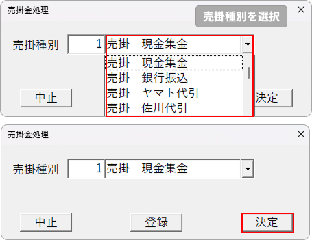 ⑤-「売掛入金種別選択」画面が開きますので、種別を選択します。