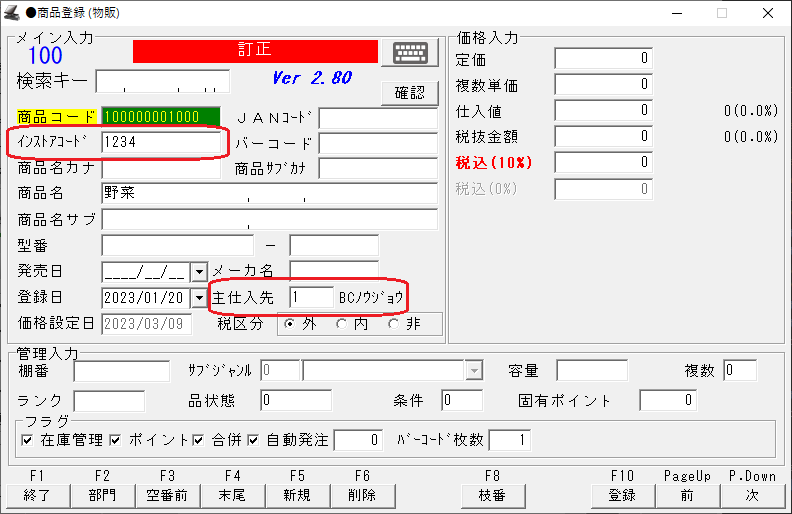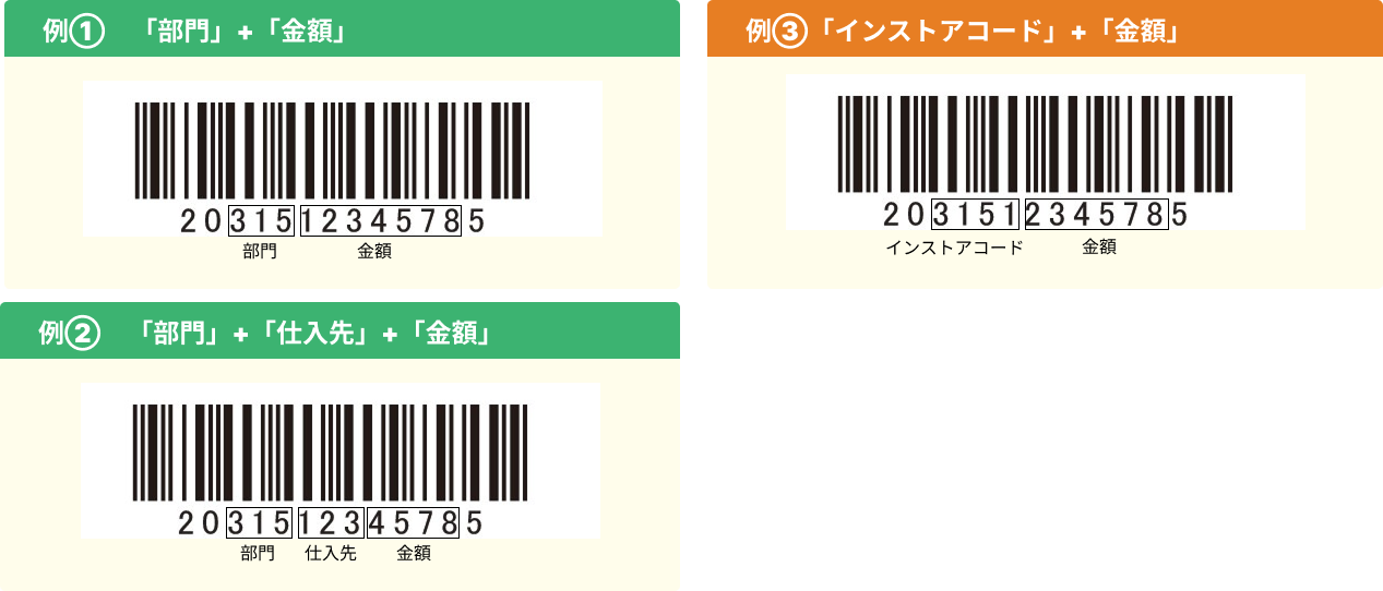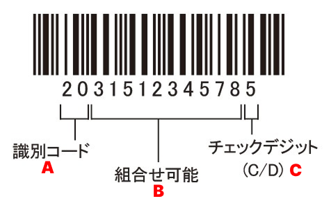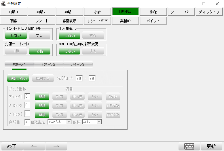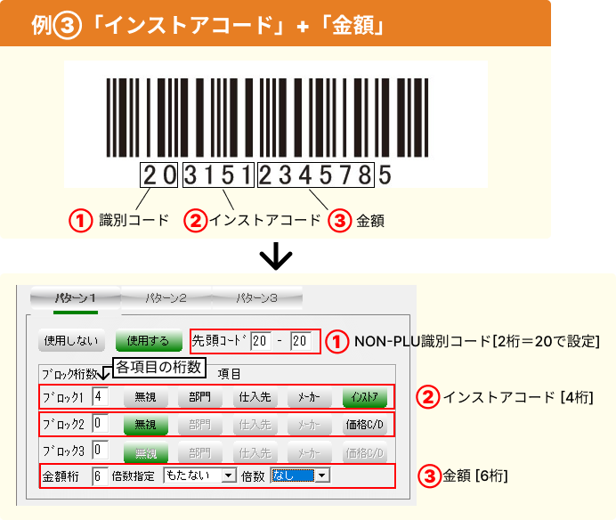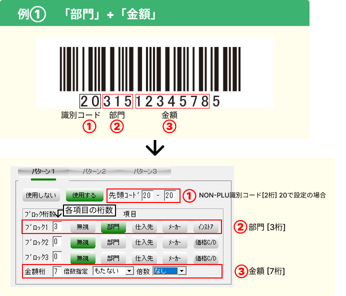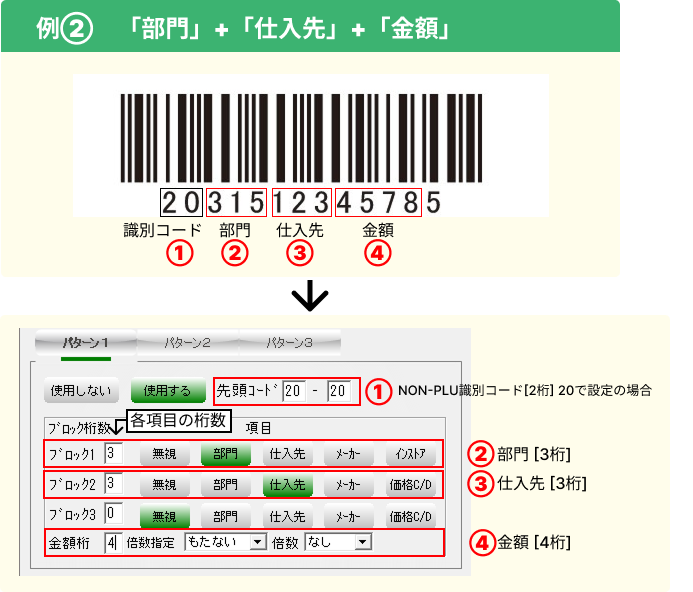 ブロック桁数 : 先頭コード、金額以外の情報のために割り当てる桁数を3ブロックまでに分けて指定できます。 項目 : ブロック桁数で指定したブロックにもたせる情報の種類を選択します。 (無視/部門/仕入先/メーカー…の中から選択。) 金額桁 : 金額として利用する桁数を4~7桁内で指定します。 倍数指定 : 金額桁の先頭桁を、金額の倍数として使用。[する] [しない] 設定。 金額桁の先頭1桁が「0=0倍」「1=10倍」「2=100倍」「3=1000倍」となります。 |