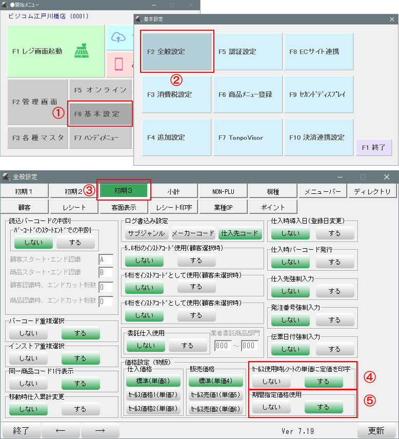 ④-「セールス(使用時)レシートの単価に定価を印字」を「する」にします。