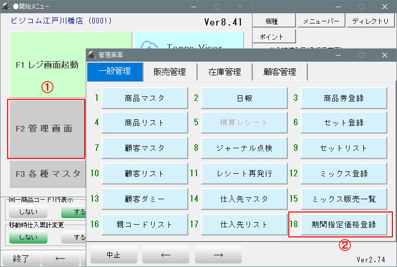 ①- 開始メニュー >「F2 管理画面」を押します。