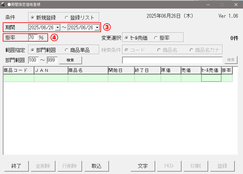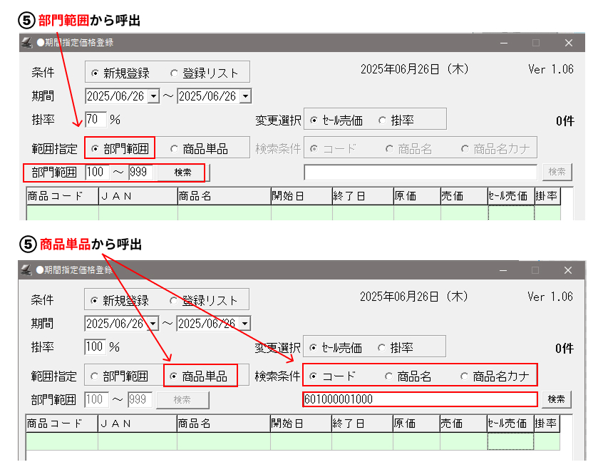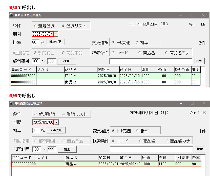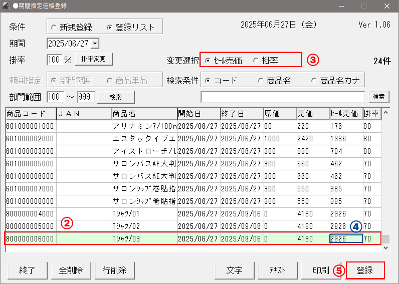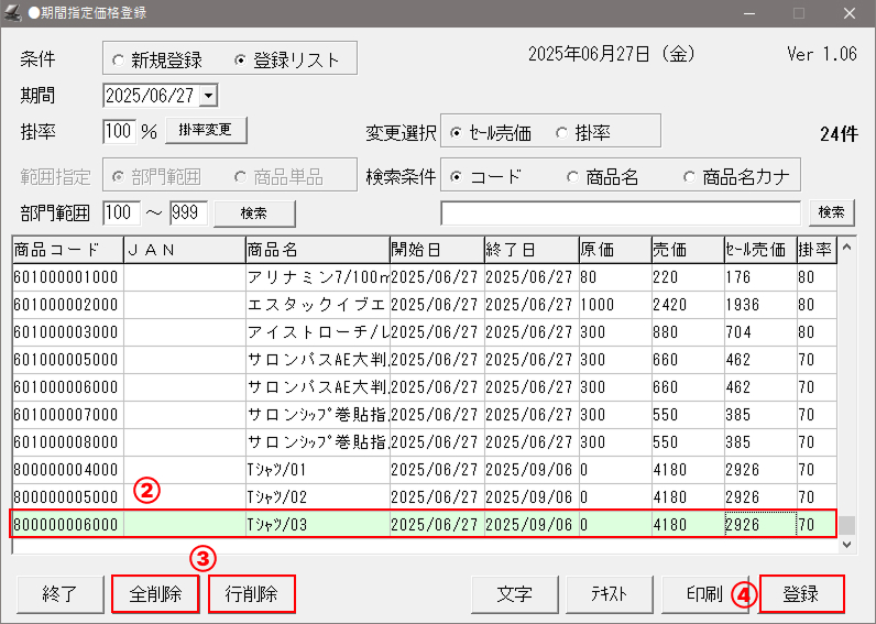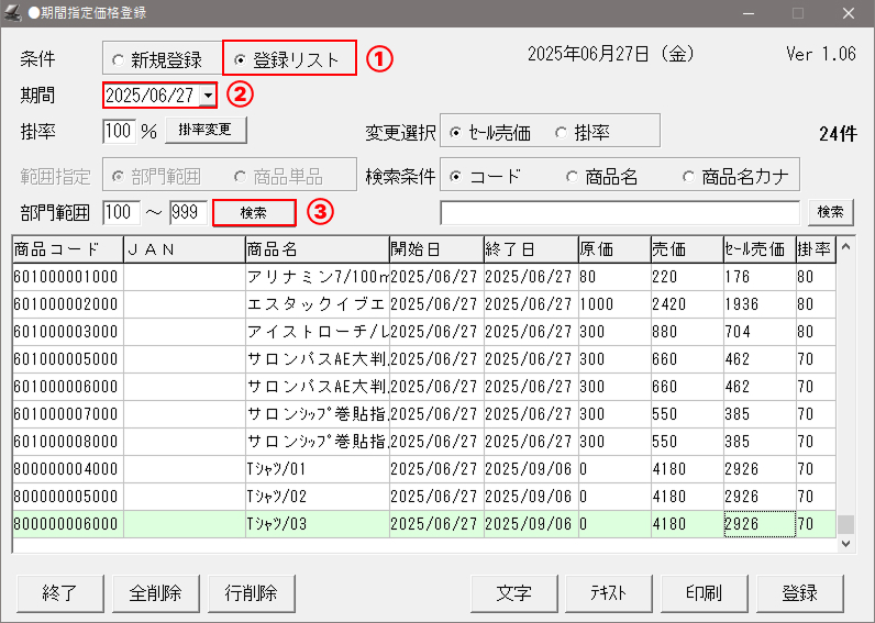 (②で入力した日付の日に期間指定価格登録されている商品がすべて呼び出しされます。)