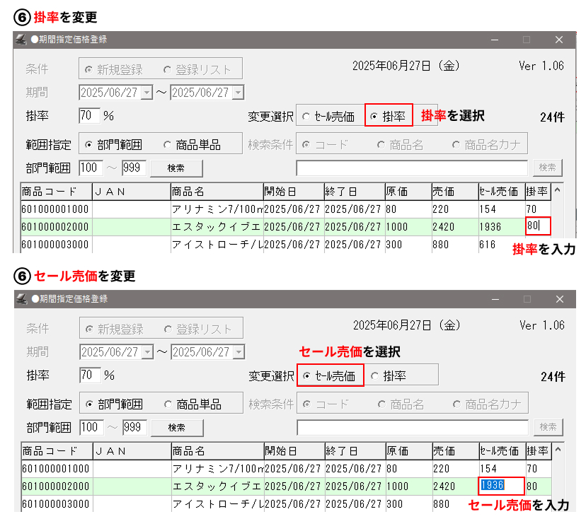 ⑥-呼び出した商品から個別に「セール売価」「掛率」を変更します。