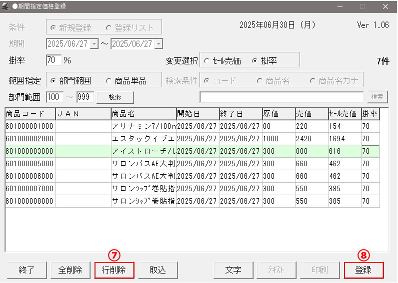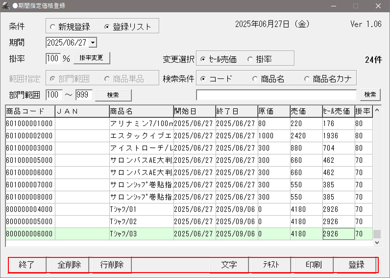| 行削除 | 選択しているレコードの商品についての期間指定価格の設定を削除します。 (選択時:背景色[黄緑]) |