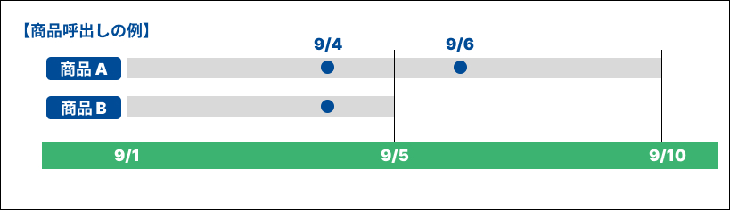 ②「期間」で9/4で指定した場合…セール期間に含まれる「商品A」「商品B」が呼び出される。