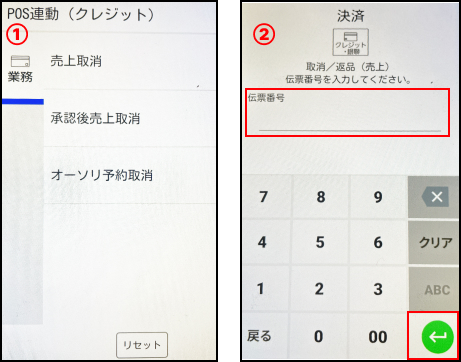 ①-「売上取消」「承認後売上取消」「オーソリ予約取消」のいずれかを選択します。