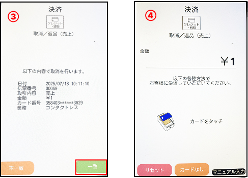 ③-取引内容の確認画面がでますので、返品操作する内容と合っていれば「一致」を押して下さい。