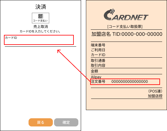 売上時に発行されたレシートの「注文番号」を入力して、「確定」ボタンを押してください。