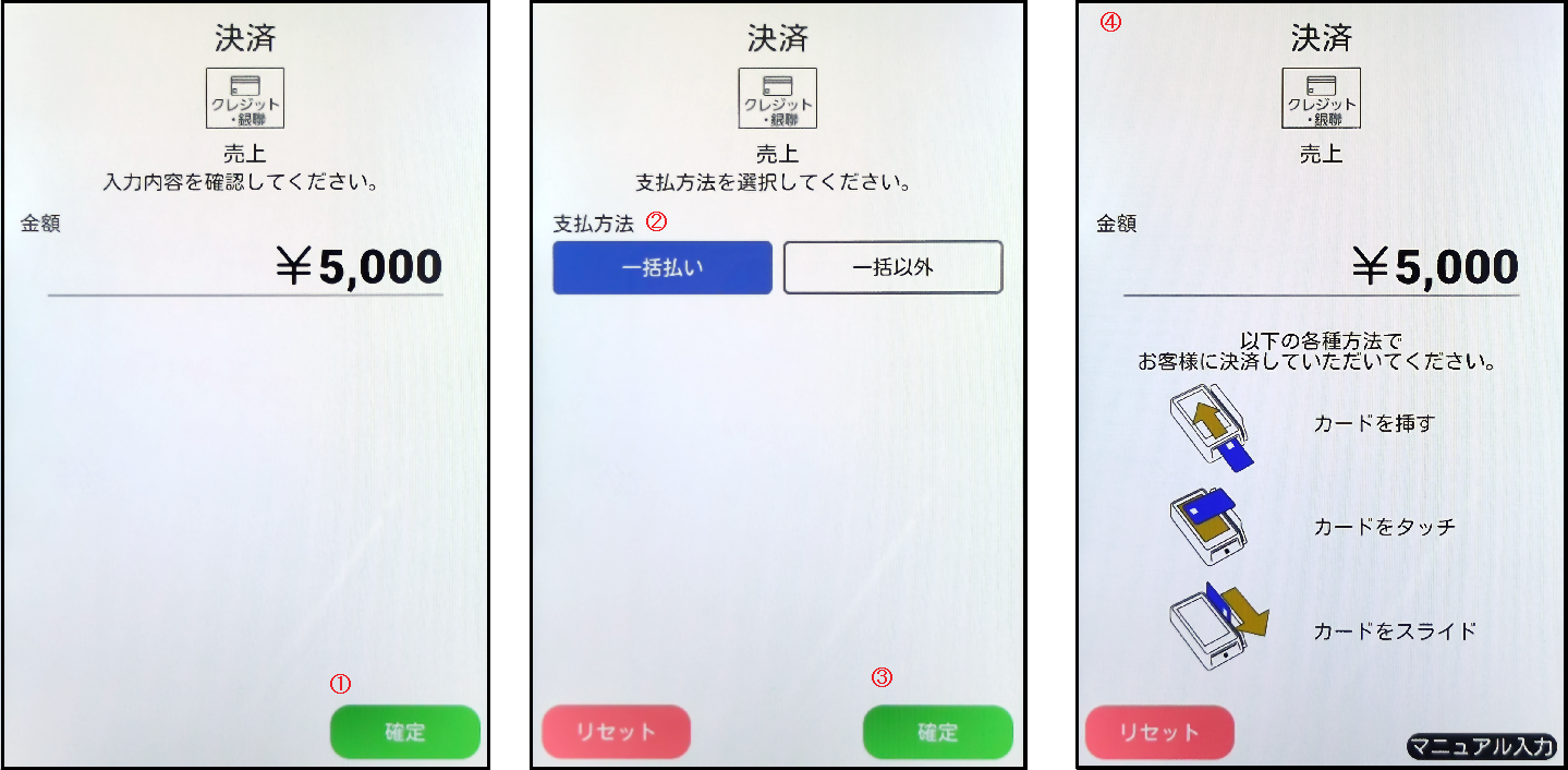 ④-お客様側の端末(JT-VC10)でカード挿入/タッチ/磁気スライドをして決済します。
