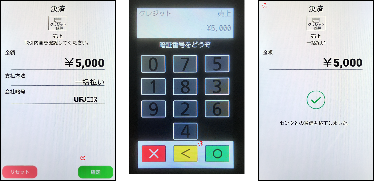 ⑦-「センタとの通信を終了しました」で、伝票が印字され、カード抜取りの指示表示がされます。