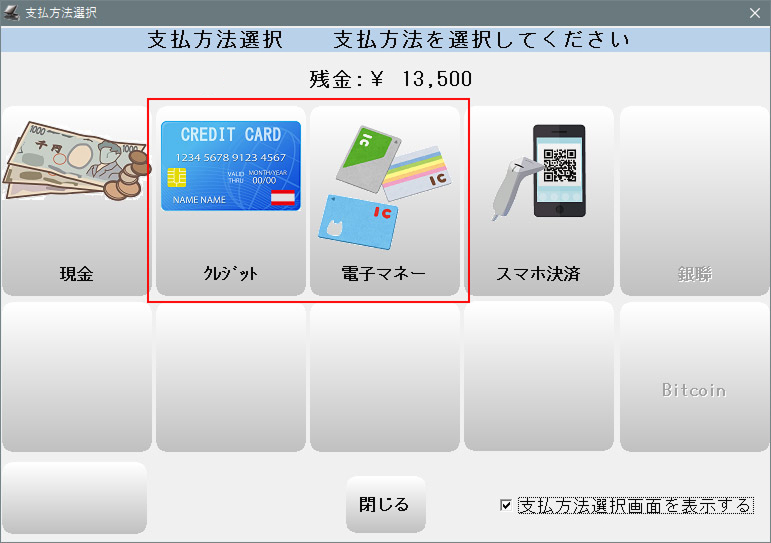 ①-BCPOS販売画面で商品を呼び出し後、小計ボタンを押します。「支払方法選択画面」で「クレジット」または「電子マネー」を選択します。