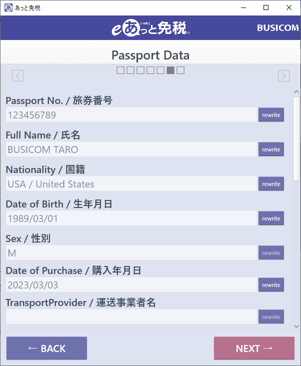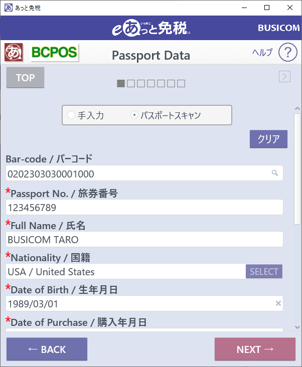 BCPOSの処理が終わると、eあっと免税が立ち上がり、BCPOSで読取ったパスポートの免税処理を表示します