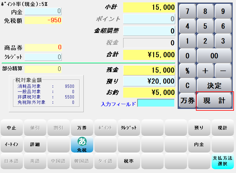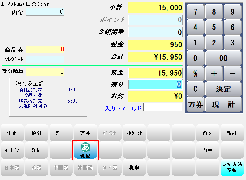 ③-小計画面で「免税」ボタンを押します。