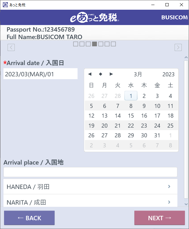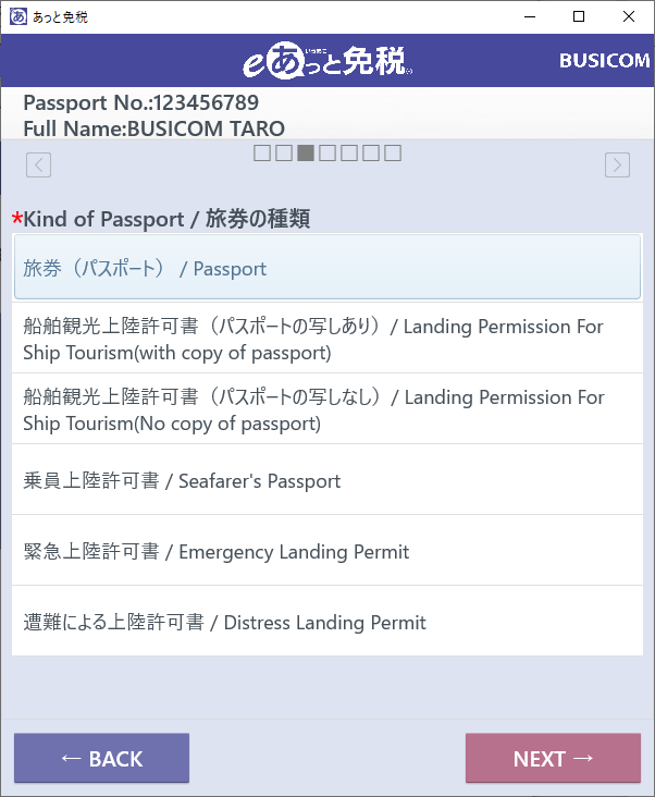 ①-eあっと免税のパスポートデータ画面を表示「NEXT」を押します。