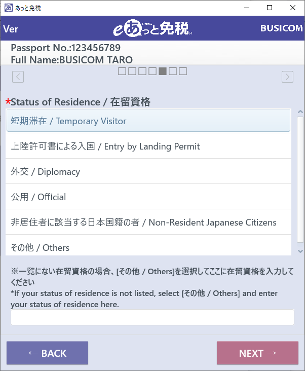 ⑤-「在留資格」(必須項目)を選択し「NEXT」を押します。
