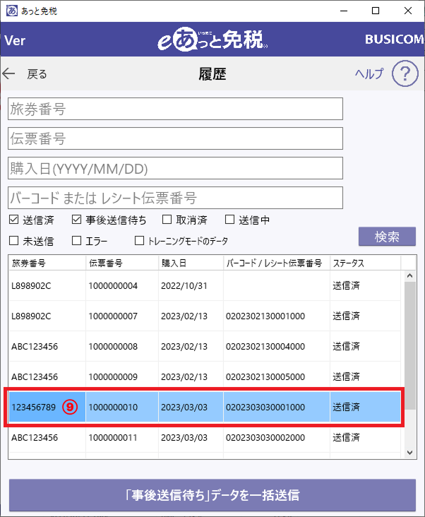②-「日付」や「伝票No/バーコード」で「検索」して対象のレコードを押します。