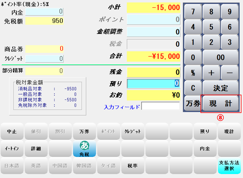 ⑧-レシートを見て「現金」または「決済」を確認し、同じ処理を行い「現計」を押します。