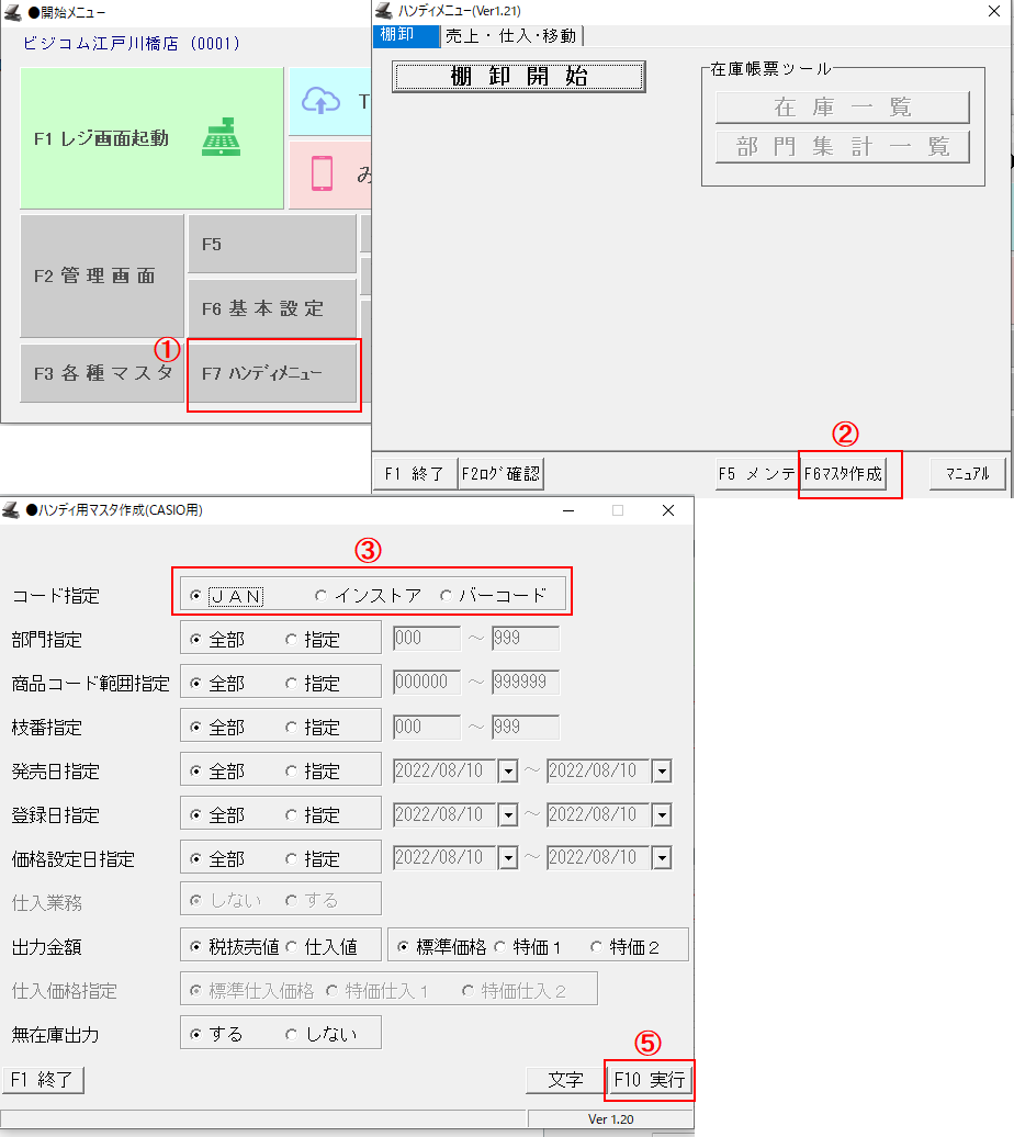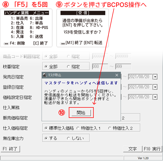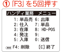 ⑧-ハンディの「ハンディ業務メニュー」画面で「F5」を5回押します。
